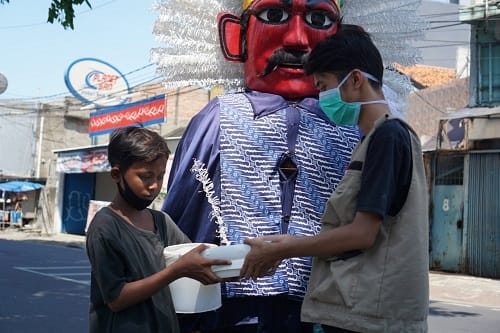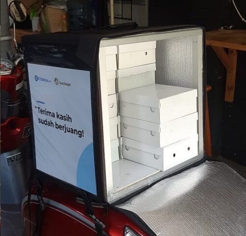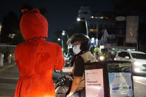 Dengan tetap menerapkan protokol kesehatan, mobil pickup Pedagang Tahu Bulat dengan banner bertuliskan “Tahu bulat gurihnya bikin baper, tetap jaga jarak, jangan lupa pakai masker”, membagikan paket makanan dan tahu bulat di titik-titik tertentu yang dibantu juga oleh relawan dari TurunTangan.